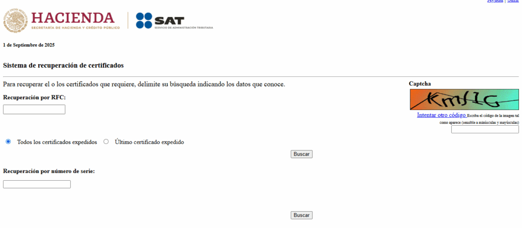 - Ingresa tu RFC o el número de serie del certificado que deseas descargar.